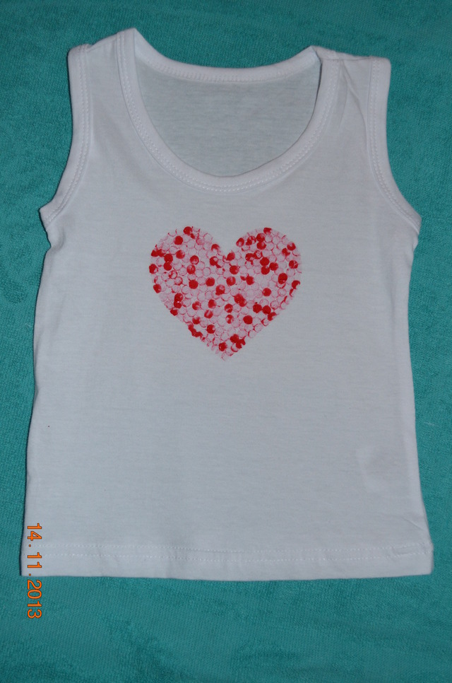 Na początku podkładamy w środek koszulki tekturkę aby farby nie farbowały jej tylnej części.Z drugiej części tektury wycinamy szablon (np. serce), który przytwierdzamy taśmą w miejscu w którym chcemy zrobić nadruk.