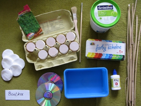 Tydzień przed świętami wysiewamy rzeżuchę do skorupek jajek jako podłoża używając wacików kosmetycznych. Nie żałowałam nasionek, gdyż chciałam, by moje jajeczka miały bujne czuprynki. Wysiewamy i pielęgnujemy zgodnie z instrukcją na opakowaniu.