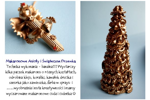 Szukamy przeróżnych makaronów i przy pomocy kleju doczepiamy je do siebie, tworząc różne postaci, my akurat robimy anioły, do główki przyczepiamy drucik, wygięty obcążkami w celu uzyskania zawieszki. Gotowego anioł malujemy farbą albo akrylową, albo w sprayu, jak co komu pasuje. Na koniec możemy przyozdobić dzieło koralikami.